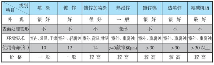 我公司橋架表面處理可分為噴涂、鍍鋅、鍍鋅加噴涂、熱浸鋅、鍍鋅鎳、熱噴鋅,對各自的性能和特點進行比較列表如下: