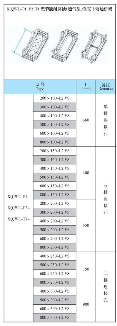 XQJWL-P1、P2、T1型節能耐腐蝕(透氣型)垂直下彎通橋架型號參數: